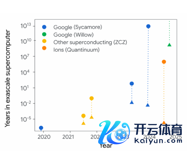 2019年,通过RCS基准测试披露,最快的传统规划机也需要一万年能力完成Sycamore所能完成的使命。而Willow出现后,其在五分钟内完成的规划将需要橡树岭国度实验室中领有1.68exaflops性能的超等规划机消耗10²⁵年能力完成。