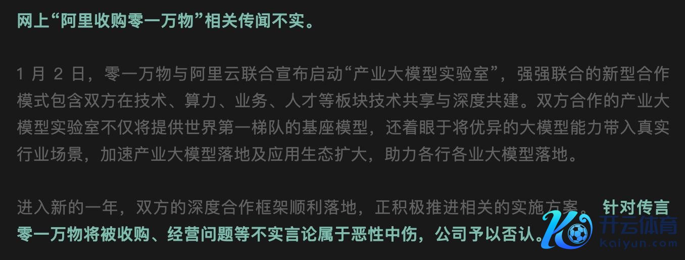 2025年1月6日,一则对于“01万物解散了 卡和预查察团队卖给阿里了”的听说运转出当今酬酢媒体。飞速,零一万物创举东谈主兼CEO,对此进行了辟谣: