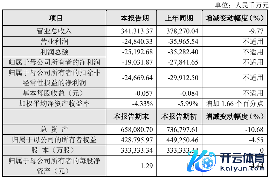 叙述期内,公司达成买卖总收入 341,313.37 万元,较上年同期减少 9.77%;包摄于母公司通盘者的净利润-19,031.87 万元,较上年同期改善 31.64%;包摄于母公司通盘者的扣除非平凡性损益的净利润-24,669.64 万元,较上年同期改善17.53%。放置 2024 年 12 月 31 日,公司总财富 658,080.70 万元,较叙述期初减少 10.68%;包摄于母公司的通盘者职权 428,795.97 万元,较叙述期初减少 4.55%;财富欠债率 34.84%,呈下落趋势。
